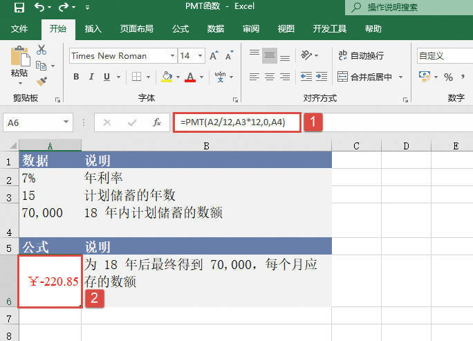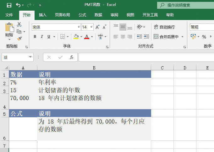 已知储蓄存款的年利率、计划储蓄的年数、18年内计划储蓄的数额,要求计算的金额为18年后最终得到70 000,每个月应存的数额。打开“PMT函数.xlsx”工作簿,本例中的原始数据如图19-102所示。具体的操作步骤如下。