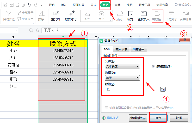 操作方法:选中B列——【数据】选项卡——【有效性】,在弹出的数据有效性小窗口中【有效性条件】选择【文本长度】,【数据】选择【等于】,【数量】选择【11】,【确定】即可。
