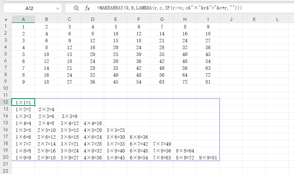 用=MAKEARRAY(9,9,LAMBDA(r,c,IF(r>=c,c&”×”&r&”=”&c*r,””))),仅显示下三角部分,优化乘法表显示: