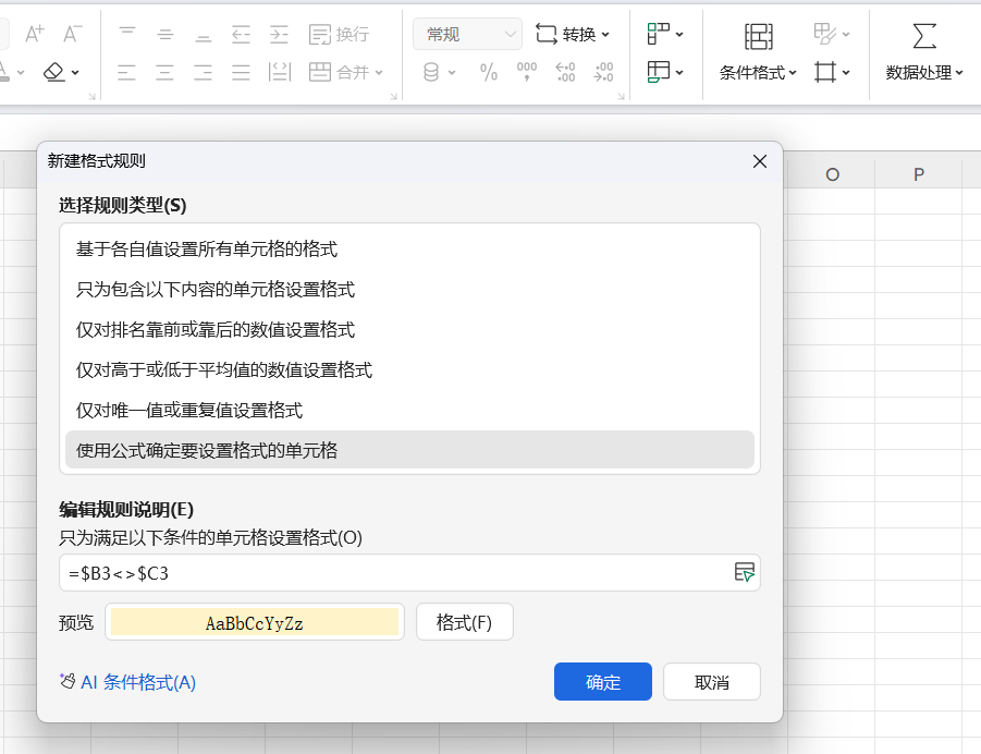 操作步骤:选中待对比的数据区域,点击菜单栏“条件格式”,选择“新建规则”,在对话框中勾选“使用公式确定要设置格式的单元格”;
