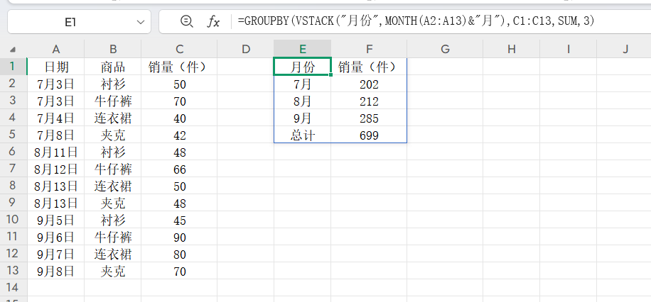核心公式:=GROUPBY(VSTACK(“月份”,MONTH(A2:A13)&”月”),C1:C13,SUM,3)