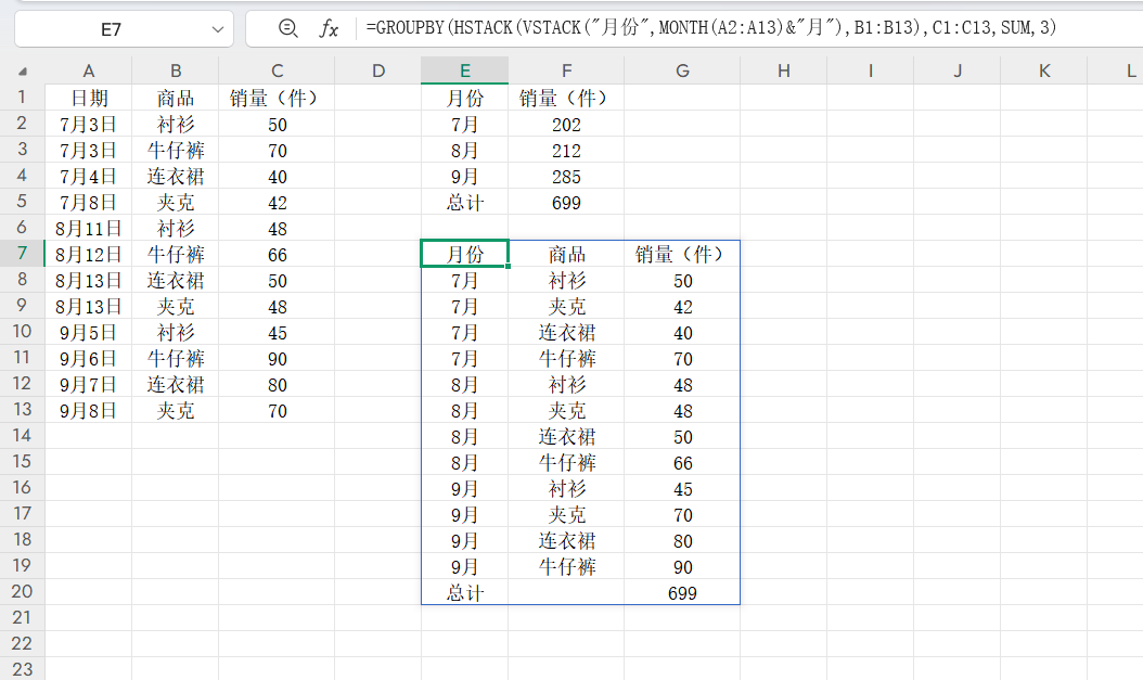 若需同时按月份和产品两个维度汇总,微调GROUPBY函数公式即可。