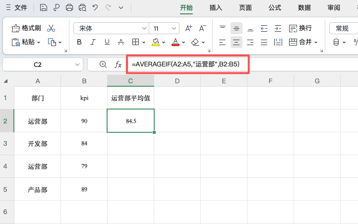 示例:=AVERAGEIF(A2:A5, "运营部", B2:B5)