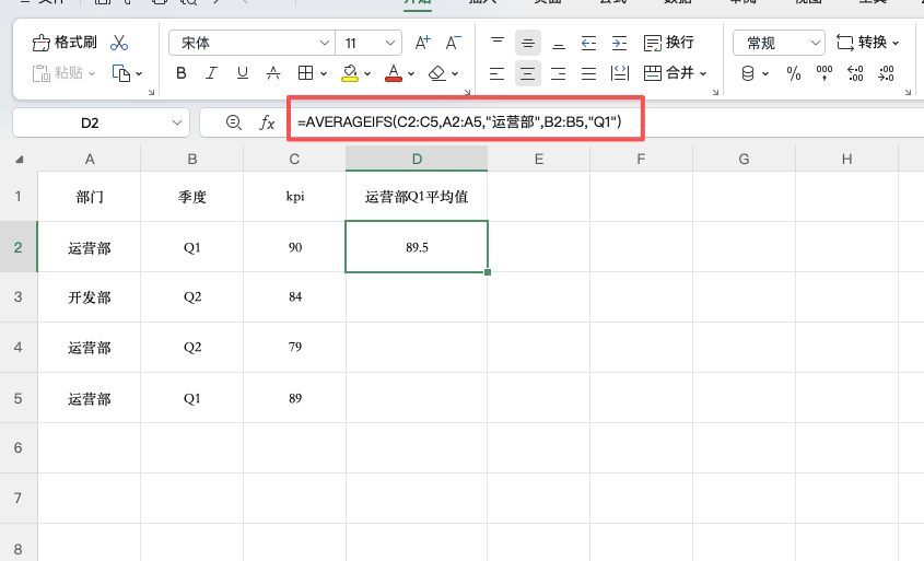 示例:=AVERAGEIFS(C2:C5, A2:A5, "运营部", B2:B5, "Q1")