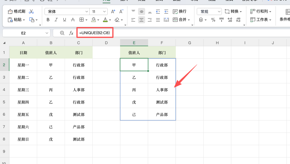 例如,在值班记录表中,需要从 B2:C8 区域提取不重复的人员名单。在 E2 单元格中输入以下公式: