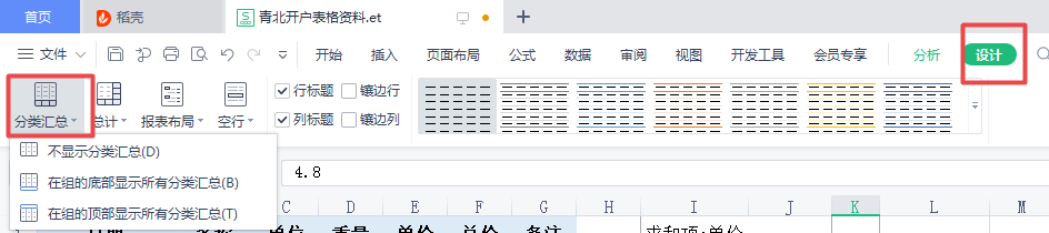 选中透视表中任一单元格——【设计】——【分类汇总】——显示或隐藏分类汇总