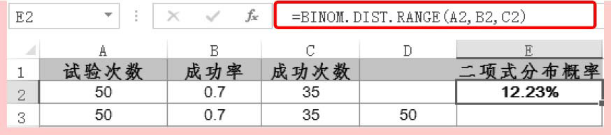 例如要求计算当成功概率为70%时,在50次试验之中出现35次成功的概率。