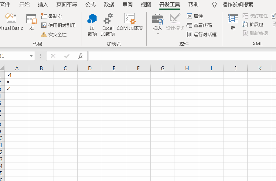 点击开发工具——插入——表单控件——复选框(窗体控件),然后右击控件选择【编辑文字】,将相应的内容进行删除,这样选中就可以在方框内打勾。
