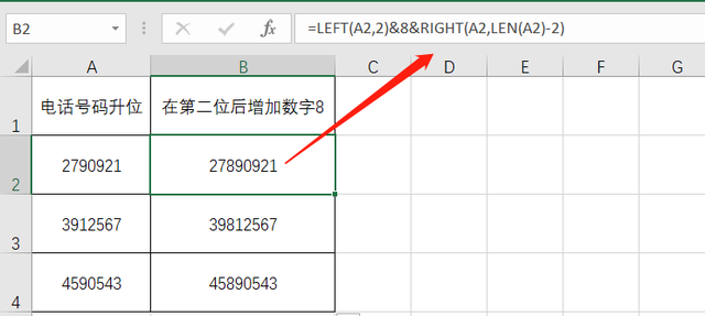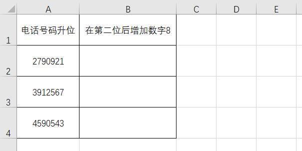 如下图Excel表格实例所示,需要在电话号码中指定的位置后面添加同一个数字,即在电话号码第二位后增加数字8。如何操作呢?
