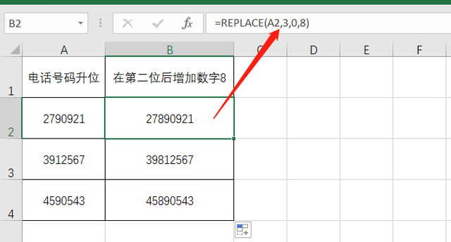 除了使用REPLACE函数,当然也可以用其他函数来完成,比如输入公式=LEFT(A2,2)&8&RIGHT(A2,LEN(A2)-2)
