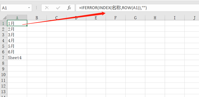 第二步:在单元格中输入公式=IFERROR(INDEX(名称,ROW(A1)),””),想下填充即可获取结果。