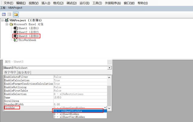 按Alt+F11打开VBA界面,随后点击视图——属性窗口,随后选中要显示的工作表,将原先的Visible属性为“2-xlsheetVeryHidden”更改为“-1—xlsheetVisible”即可显示。