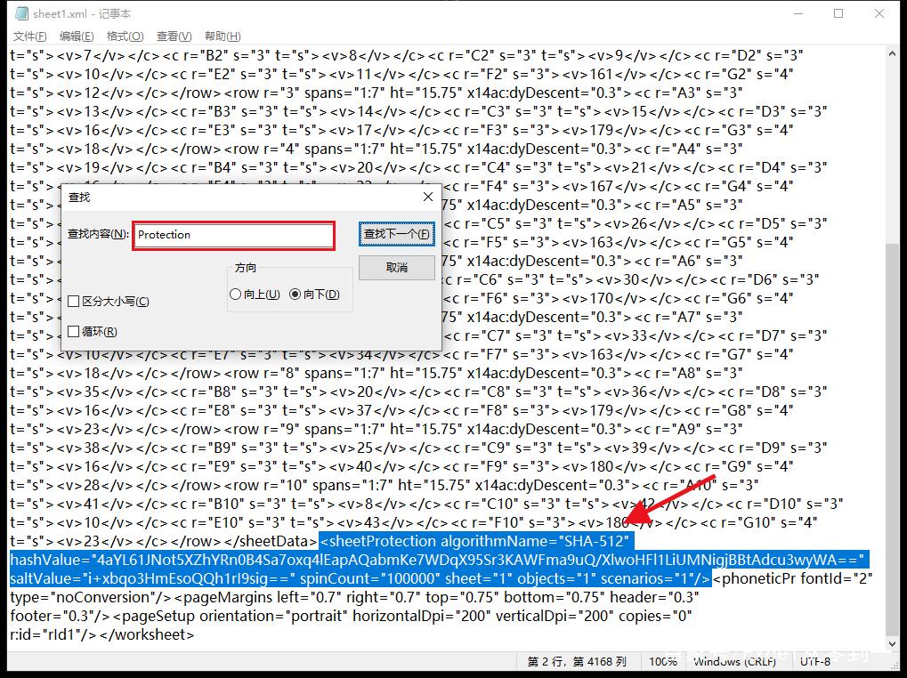 在记事本中我们按下Ctrl+F调出查找,在查找内容中输入:Protection,将这个单词所在的尖括号内的所有文字都删除掉,如下图3蓝色区域所示,删除完毕后保存一下将其放回压缩包中,会提示是否需要替换文件,选择替换复制文件即可,最后将压缩包关闭掉,将zip更改为xlsx这样的话就会又变为Excel文件,我们双击打开文件就会发现保护已经消失了,可以修改数据了。
