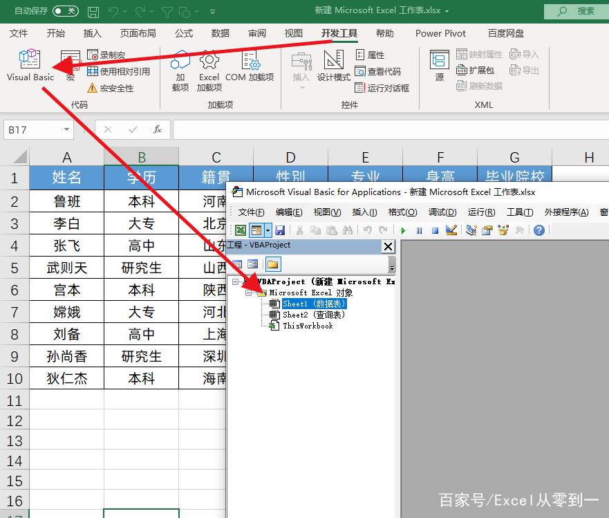 首先我们需要看一下需要破解工作表保护的表格它在vba界面中对应的是sheet几,如下图1,我们想要破解数据表中的保护,点击visual basci,在vba的界面可以看到数据表对应的是sheet1。