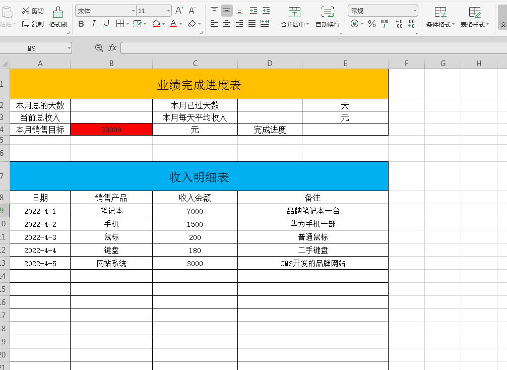 在日常的工作中很多小伙伴需要统计每天的销售明细,然后根据本月制定的销售目标,核实已完成业绩,平均每天业绩,截止到当天销售总额等数据,如果我们手动计算的话比较繁琐,那么如何让用Excel制作的收入明细表可以自动分析汇总数据。下图是比较制作好的表格,下面我们就一步一步实现提到的功能。