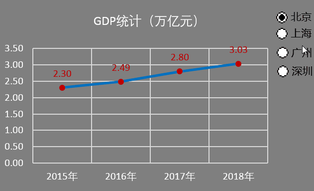 原始数据2015年-2018年北上广深四大城市的GDP数据,其中数据位于B3:E6单元格中。