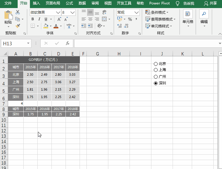 当选择框为第2个城市上海,即链接的单元格A7为2时,B9:E9单元格中的数值=B4:E4;