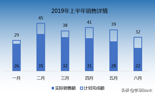 源数据为2019年1月到6月的销售综计数据,其中第1列数据为实际销售额,第2列为计划完成的销售额。