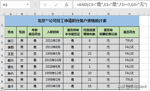 以张三为例,单元格C3、E3、F3、G3均为真时符合,有一项为假时不符合,则函数为“=AND(C3=”是”,E3=”是”,F3>=7,G3=”无”)”,这样返回值为“True”符合。依此类推。