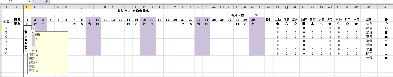 在考勤表右侧设计一个备注表,不同的考勤状态不同的形式表示。这里可以用COUNTIF函数来解决。公式为:=COUNTIF($C5:$AG5,AI$4),制作好备注说明。