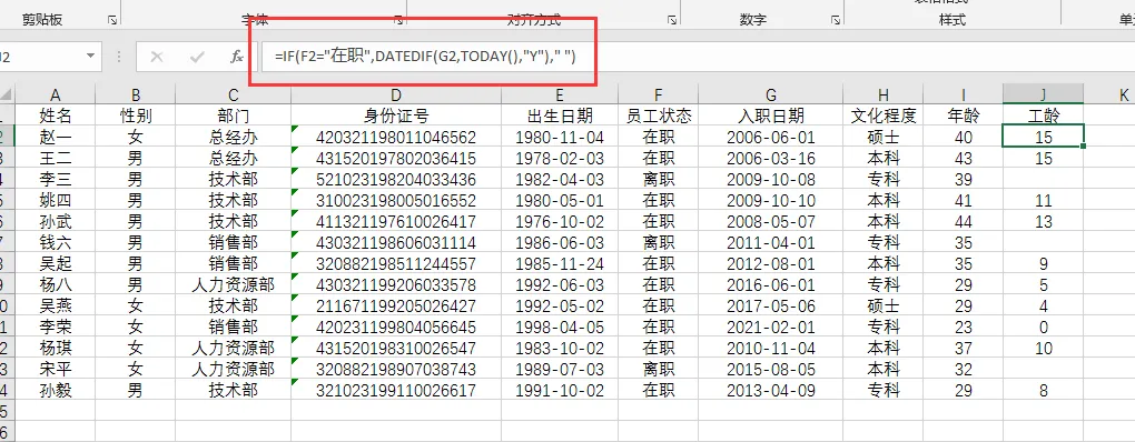 这里是加了一个IF判断函数,如果员工状态是在职,就计算出工龄,如果是离职则为空。