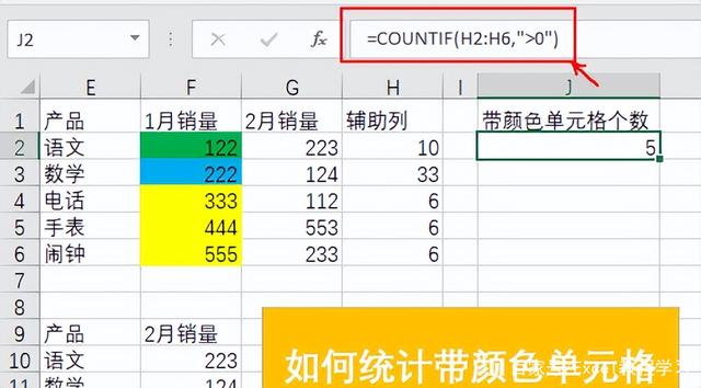 在这里要注意的就是countif函数的统计区域,它不是F列“1月销量”的源数据,而是辅助列的颜色值,然后设置统计条件为“>0”。