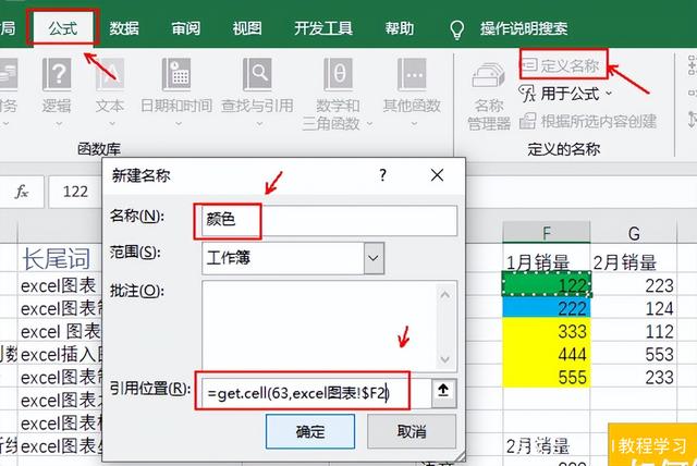 首先我们在公式工具栏下点击“定义名称”选项,在弹出的界面中填入“名称”为“颜色”,引用位置输入公式:=GET.CELL(63,excel图表!$F5)。