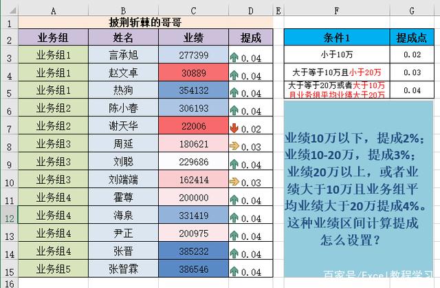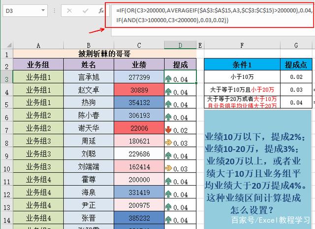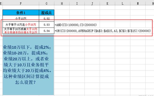 一个公式中大凡用到if和and、or三个函数,说明给出的条件会相对复杂,需要进行多重判断。如在下图中,题主需要设定条件来计算各业务员的提成:业绩10万以下,提成2%;业绩10-20万,提成3%;业绩20万以上,或者业绩大于10万且业务组平均业绩大于20万提成4%。