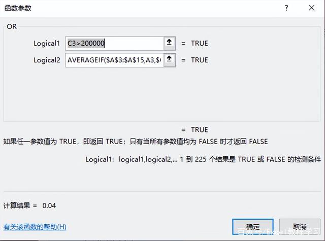 我们来捋一下这个公式的逻辑,首先是如果C3大于20万,或者所属业务组平均业绩大于20万,则返回结果0.04;