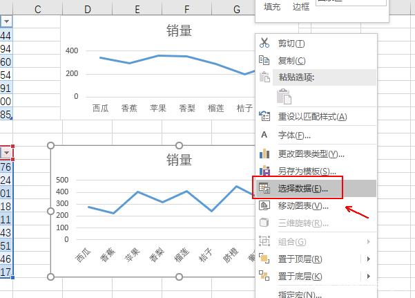 此外,如果两个表格的数据区域基本一致,即格式相同,产品列的文字也相同,那么可以直接复制第一个表格的销量数据区域,直接粘贴到下方的折线图表中。