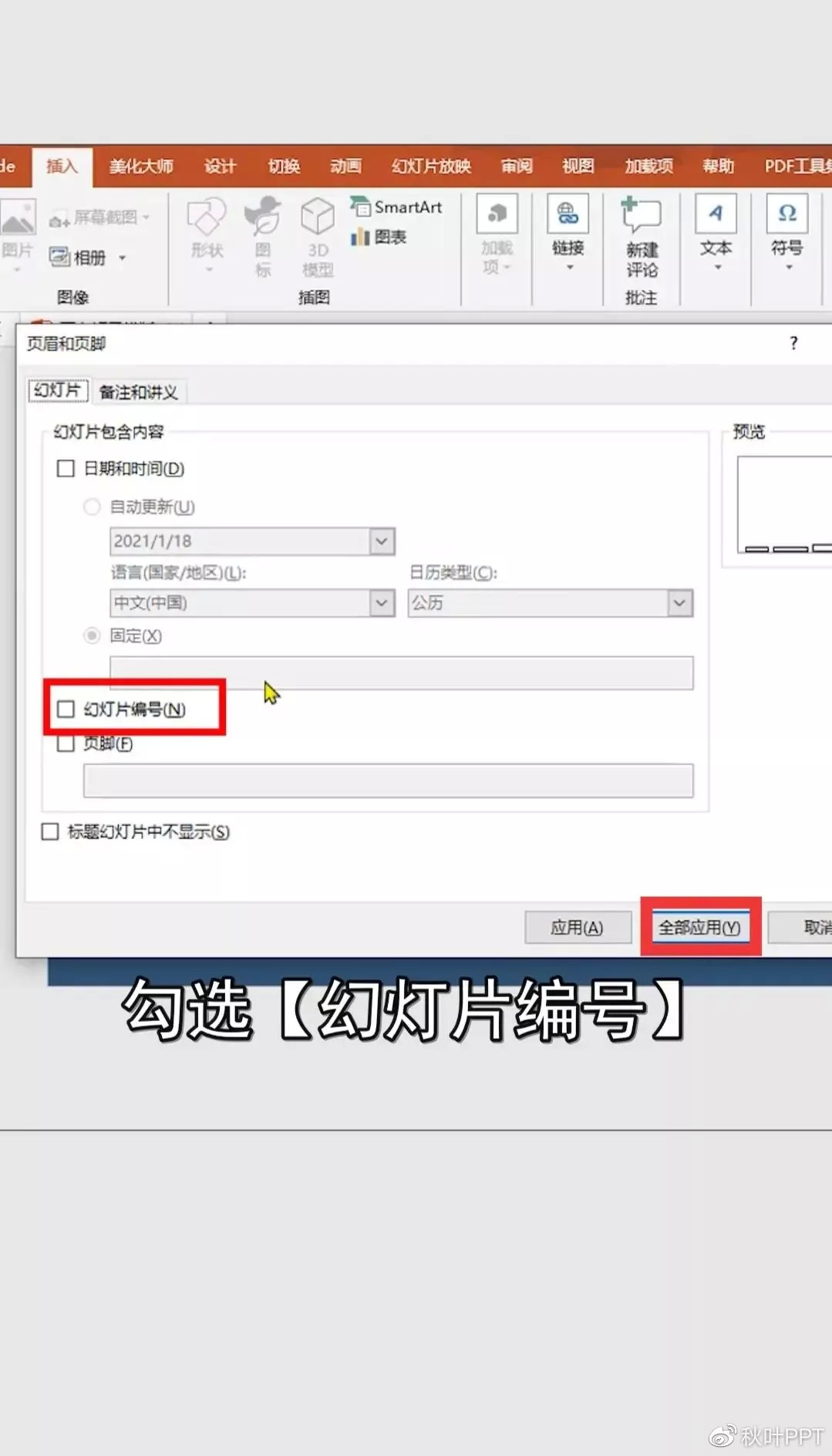 ❷ 勾选【幻灯片编号】,选择【全部应用】。