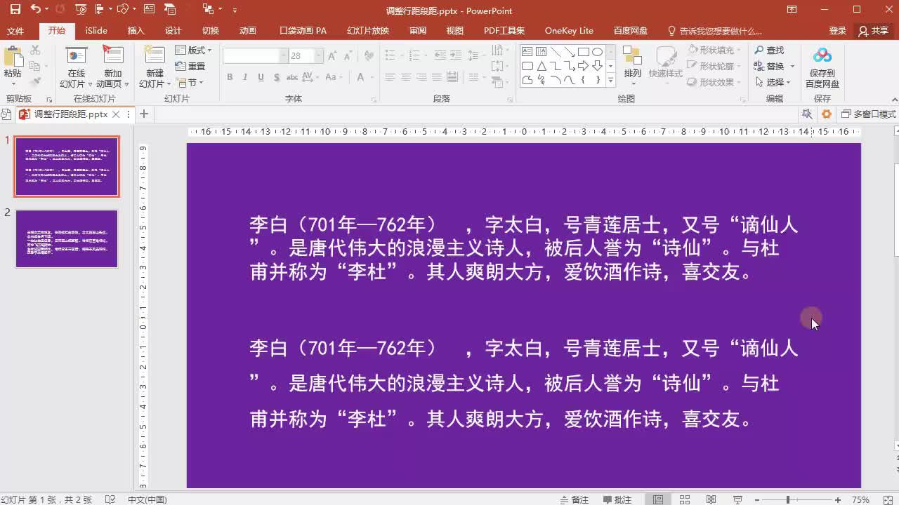 下面我们接下来看一下如何调整段间距,段间距是不同段落之间的距离。我们现在看到的第二张幻灯片中一共有三个段落。每两行文字是一个段落。