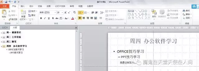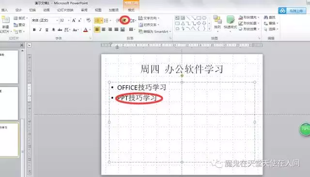 第二步,用“降低/提高列表级别”来分级显示;本案例把光标移到PPT技巧学习,然后选择工具栏中提高列表级别。效果就如本文开头的例子所示。
