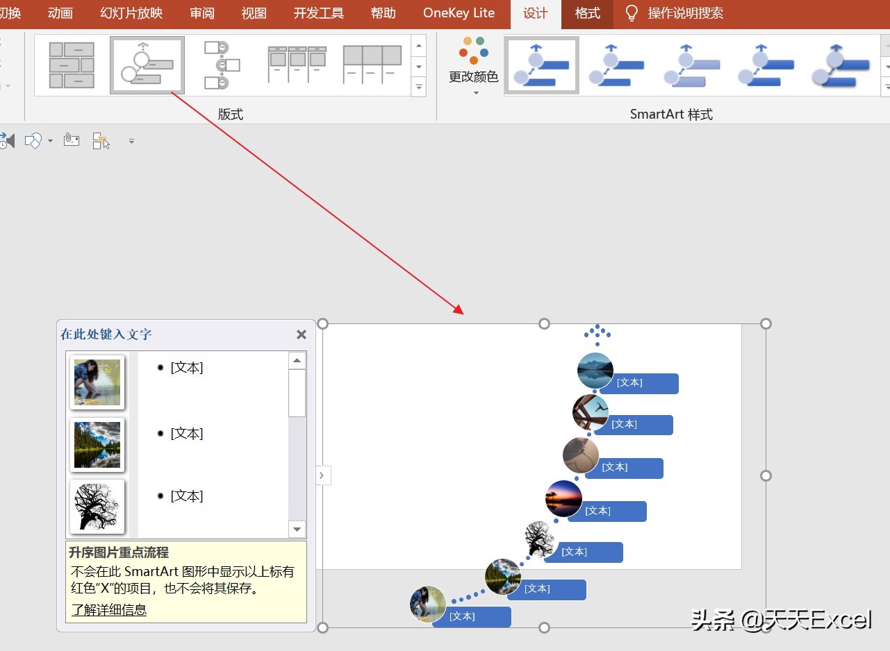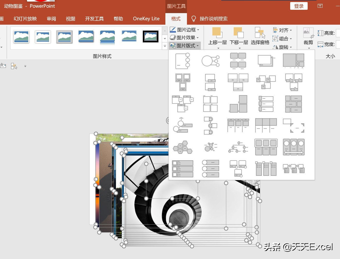 其次,全选这些素材,然后选择【图片工具】活动选项卡,可以看到有个图片版式,我们选一种合适的版式