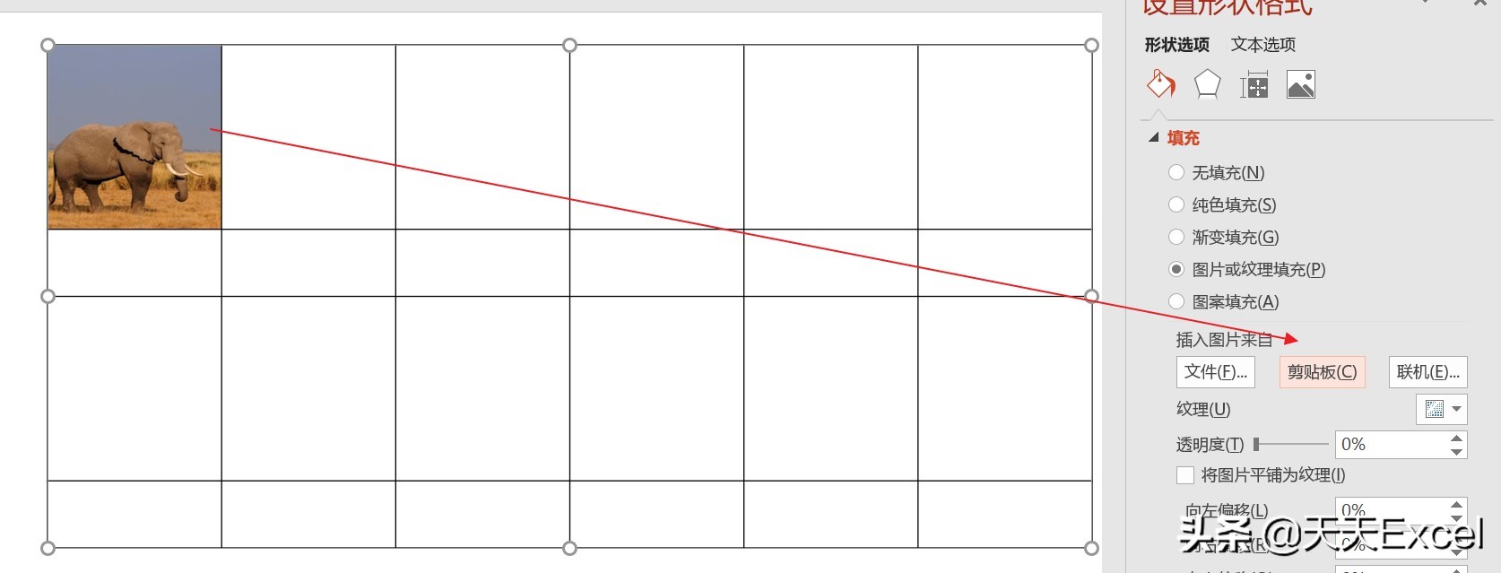 暂时保留边框,为了设置图片方便。我们这里对图片单元格进行图片填充,来自剪贴板,这样设置的就对得很齐,大小一致。