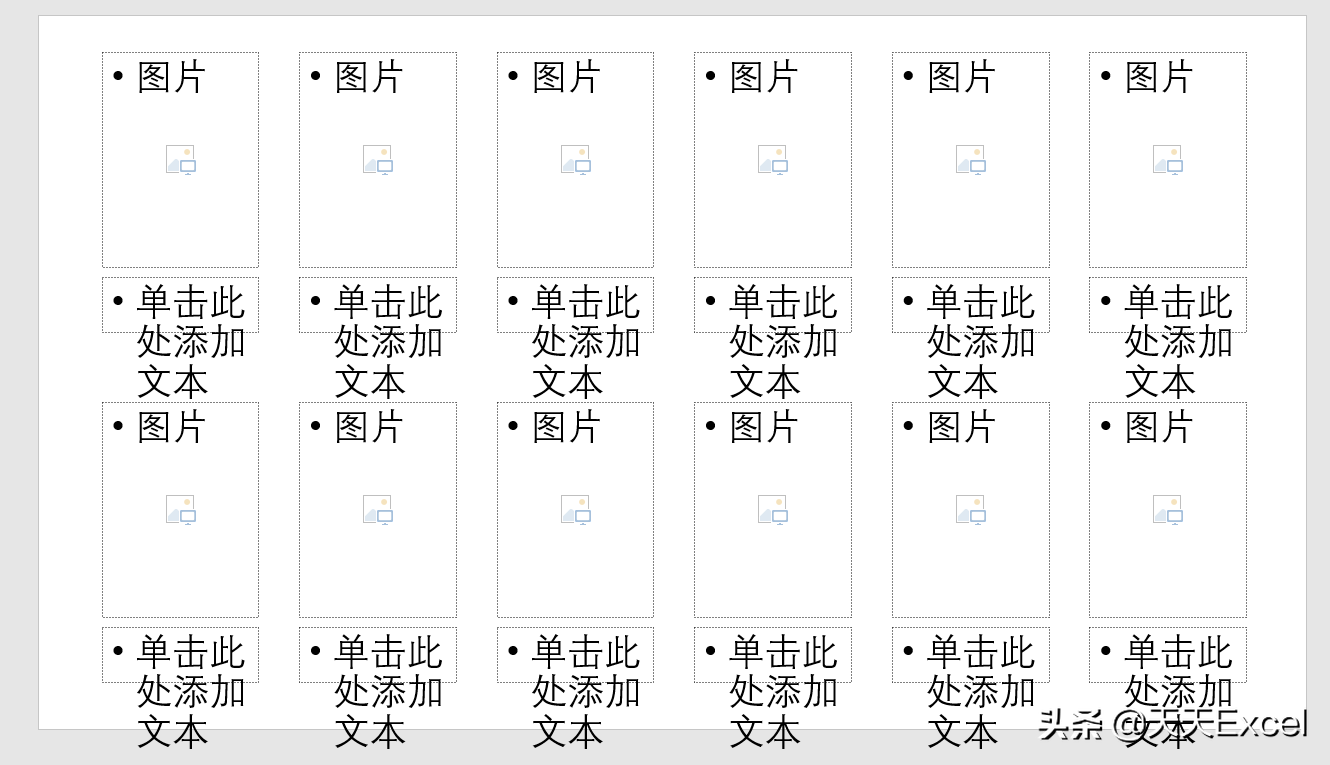 我们可以看到刚才编辑的版式已经出现在选项中,我们选择即可,打开后我们可以直接添加图片和文字,图片占位符有个很好的地方就是插入的图片都是相同的大小,相当于“自动裁减”了。