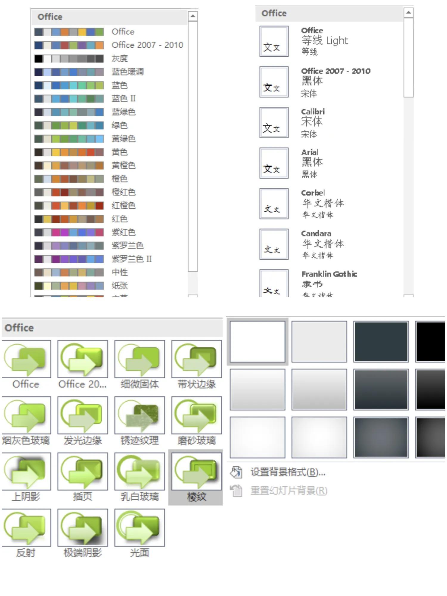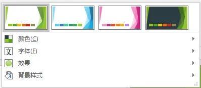 如果我们对当前主题还不够满意,在创建文件后,执行“设计”,我们可以看到主题和变体两个菜单栏。主题主要是修改版式和风格,变体主要为我们提供的颜色的修改。如果我们对当前颜色搭配还不够满意,可以单击变体一栏中的下拉按钮,里面有颜色、字体、效果、背景样式四个选项。我们可以根据自己的需要对主题的颜色进行调整,也可选择合适的字体效果设计不同的风格。