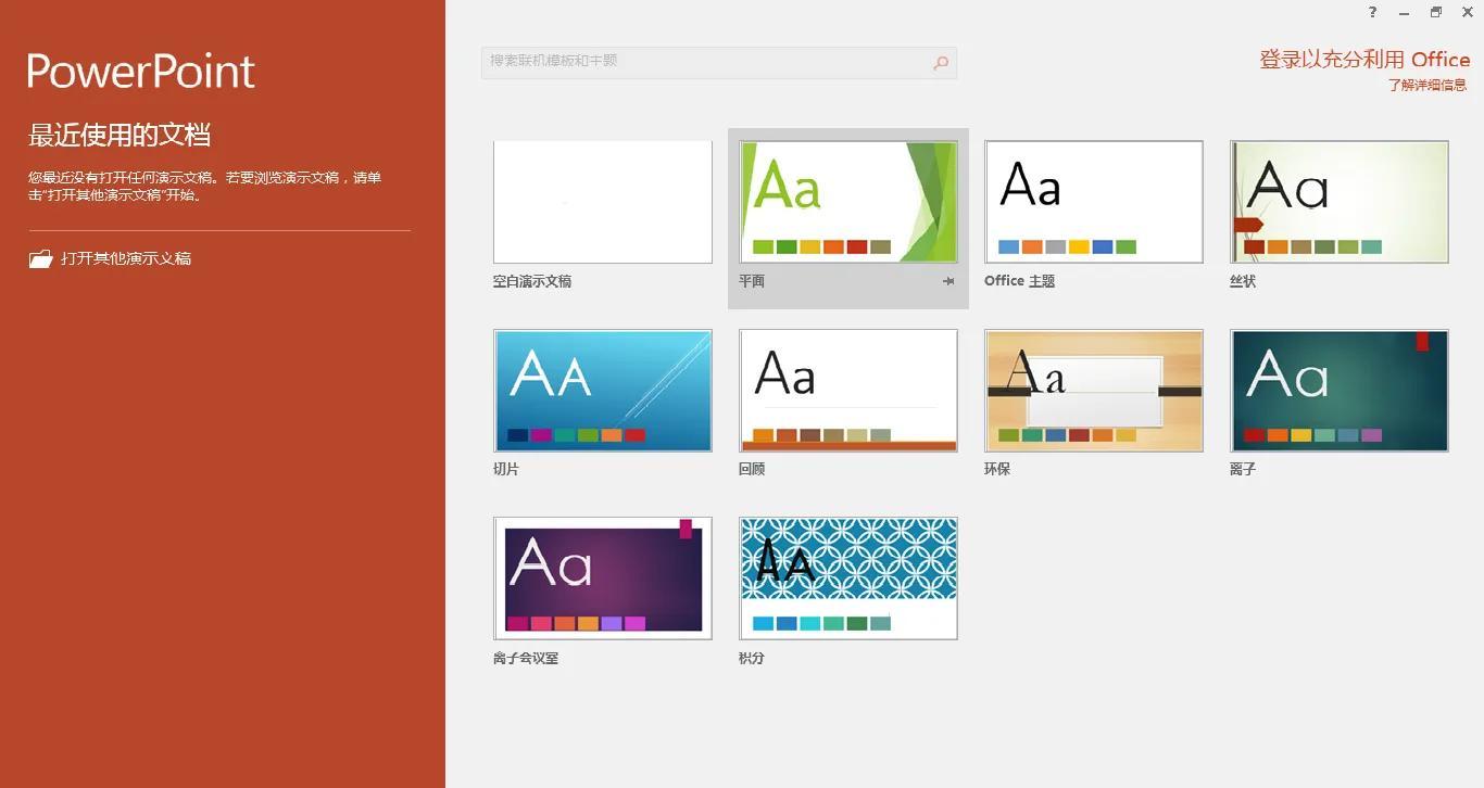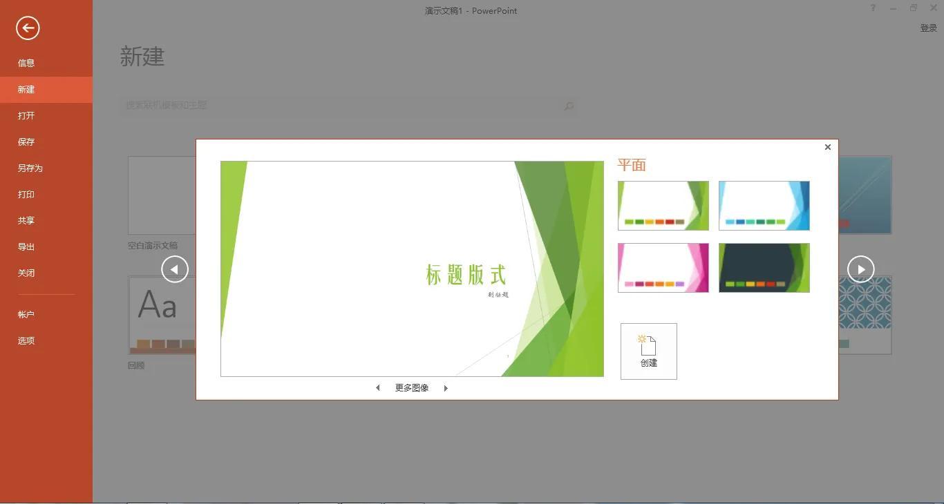 打开PowerPoint 2016后,可以看到页面右侧为我们提供了一些主题的样式,除了软件本身提供的一些主题,还可以在联网下载我们满意的主题样式。选择一个满意的主题效果,点击右键选择“预览”按钮或者单击左键,预览主题的效果,如果对当前主题效果比较满意,可以利用鼠标左键双击当前主题,或者右键单击当前主题,在弹出的对话框中点击“创建”按钮。即可创建当前主题。