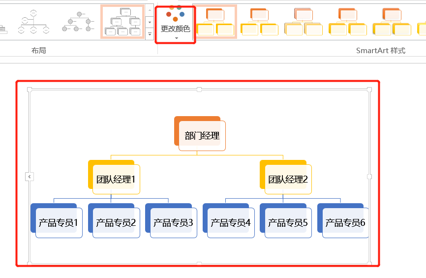 tab操作之后,可以清晰看到部门成员的上下级关系,但是还算不上是一个合格的组织架构图。通过smart art功能,即可直接生成组织架构图。