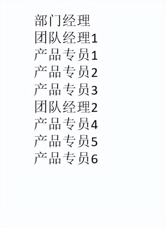 从表格我们可以看出,上下级顺序是 部门经理、团队经理、产品专员,通过tab键进行区分。团队经理前点击一下tab,产品专员前点击2下tab。结果如图: