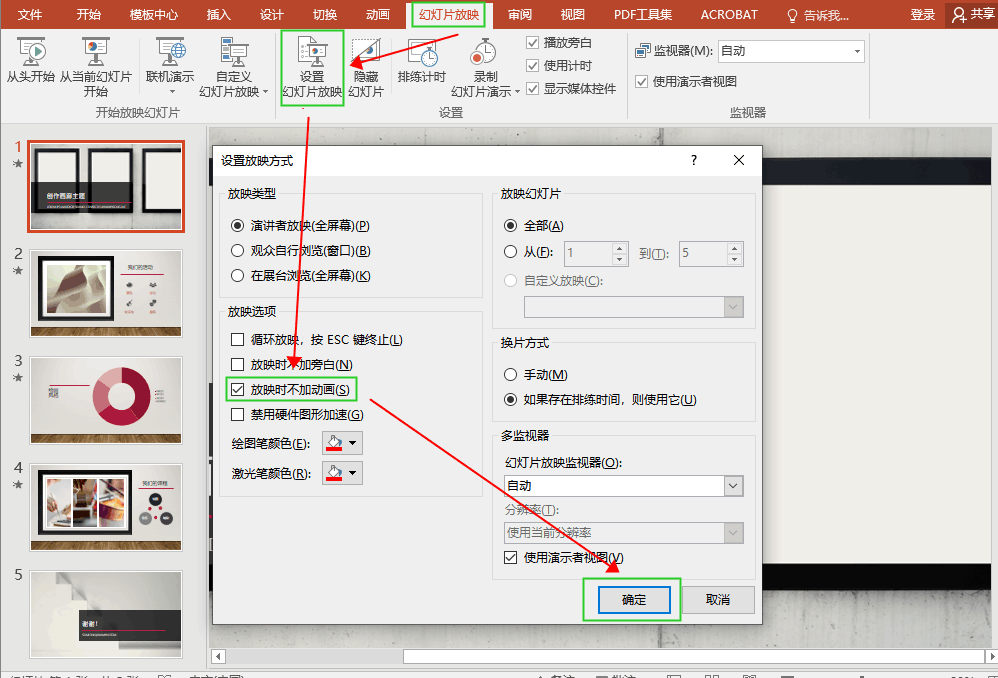 操作步骤:找到【幻灯片放映】,选择【设置幻灯片】,然后点击【放映时不加动画】,最后点【确定】就可以了。