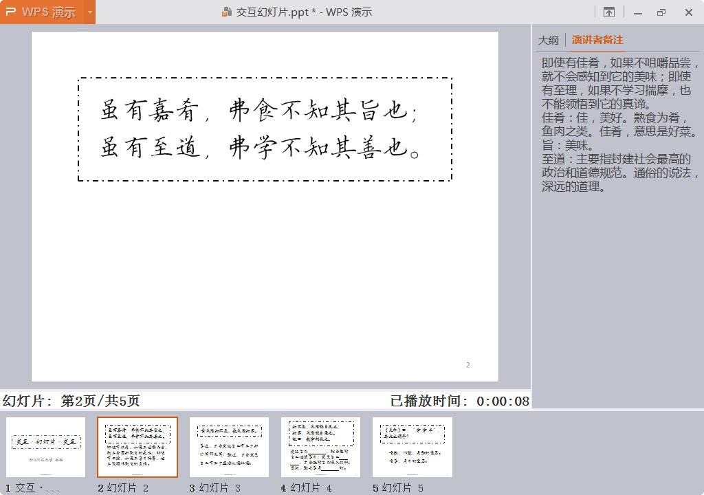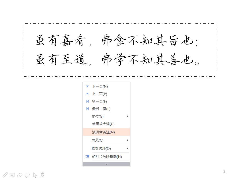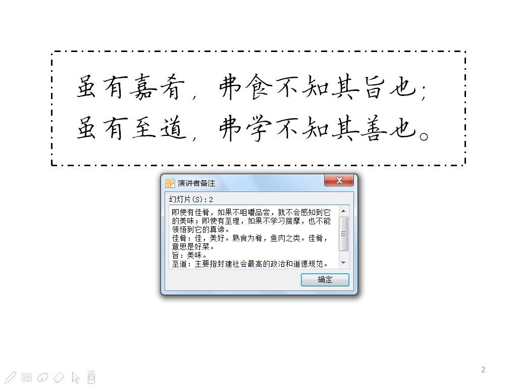 放映幻灯片的时候,尽可能让你的小学生用工具书查看词语解释,培养他们使用工具书的习惯是完全正确的。如果学生查不到,你自己又不能脱口而出,在幻灯片上打开右键菜单,查看一下备注就OK了。