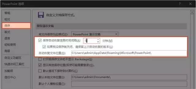 自动恢复文件的保存位置默认是C:UsersadminAppDataRoamingMicrosoftPowerPoint 文件夹,我们也可以自定义保存位置。