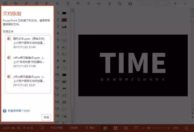 等确保一切恢复正常,重新打开 PPT 文件,此时 PPT 窗口左侧会出现【文档恢复】的选窗。