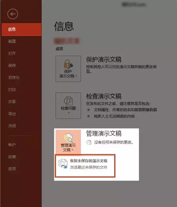 点击【文件】进入软件后台,点击【信息】-【管理演示文稿】-【恢复未保存的演示文稿】,然后在弹出的文件夹中寻找你没有保存的 PPT 文档。