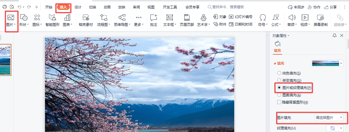 一、首先在幻灯片中插入一张好看的图片或者设置为背景图形;