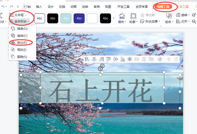 (附注:也可以先选择矩形再选中文本框,在点击【绘图工具】——【合并形状】——【剪除】也可以的哦!)
