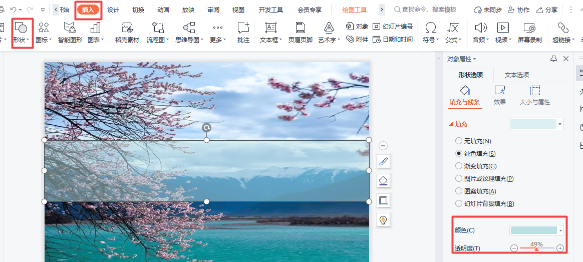 二、然后在图片上【插入】——【形状】——【矩形】,根据需要设置矩形的颜色和透明度;