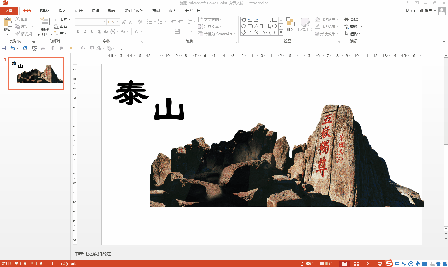首先来看第一个,右面是泰山的图片,如果字体紧紧是单一色,与图片放在一起未免有隔阂。我们希望“泰山”二字的背景也填充为泰山的景色,这样更加贴合。选择合适的字体,放大并加粗,把文本框置于顶层,放在适当位置,先选中图片,再选中文本框,在形状合并中选择相交,非常浑厚的“泰山”二字就设计好了。