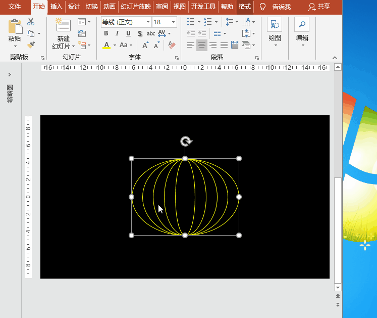 执行“插入”菜单-“形状”-“基本形状”-“椭圆”命令,幻灯片的中央绘制一个适当大小的椭圆形;设置其填充为无、轮廓为黄色、宽度为1磅;